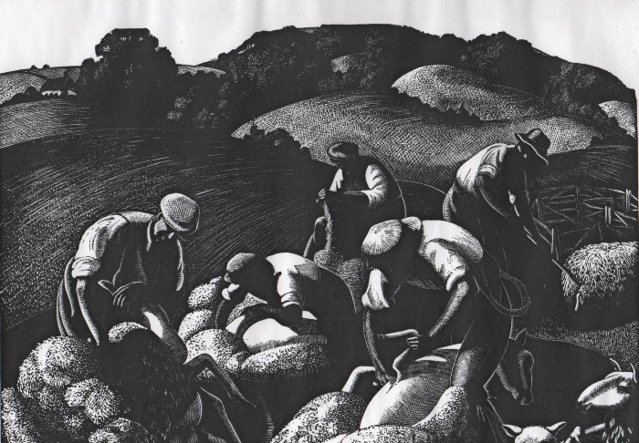 Diese Radierung untermalt das Kapitel "May: Sheep Shearing" (Mai: Schafe Scheren) aus dem Kalender "The Farmer´s Year. A Calendar of English husbandry" von Clare Leighton aus dem Jahr 1933.